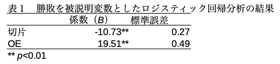 勝敗を被説明変数、OEを説明変数としたロジスティック回帰分析の結果を表1に示す。分析の結果、OEの係数は正の値を示した。この結果は、OEが高いほどチームが勝利する確率が高いことを意味する。したがって、BリーグでもOEが高いチームほど試合に勝つ確率が高いことが分かった。