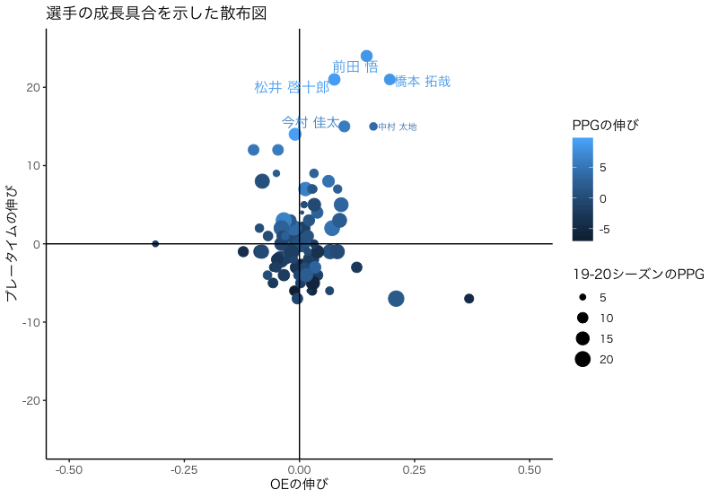 前田悟と橋本拓哉は甲乙付けがたいです。どちらもOEが大きく向上しており、前田悟は0.146、橋本拓哉は0.196もOEが伸びています。PPGの伸びはどちらも8.5で、2019-20シーズンのPPGは前田が11.5、橋本が10.5となっており、ほぼ互角です。
